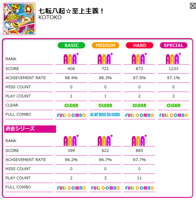 私の好きな曲である「七転八起☆至上主義!」にSPECIAL譜面が追加されていたので購入しました。